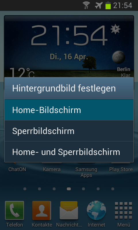 Rufe auf dem Home-Bildschirm den Menüpunkt „Hintergrundbild festlegen“ auf. Im Dialogfenster „Hintergrundbild festlegen“ ´tippst du dann die Schaltfläche „Home-Bildschirm“ an – und im Dialogfenster „Hintergrund auswählen aus“ die Schaltfläche „Galerie“.