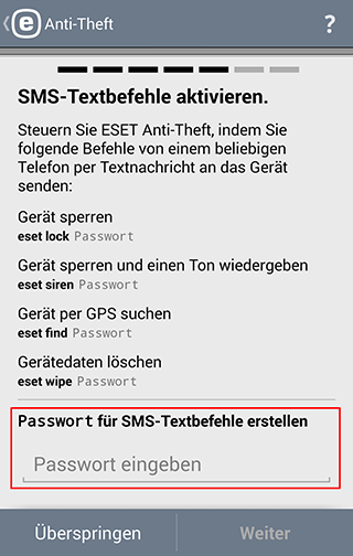 Mit SMS-Textbefehlen können Sie Ihr Gerät aus der Ferne sperren (und einen Alarmton auslösen), per GPS suchen und Daten löschen. Definieren Sie dafür ein Passwort.