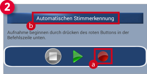 Im Fenster „Aufnahme“ tippen Sie auf die rote Aufnahme-Schaltfläche (2a), um die Tonaufnahme zu starten. Die App zeichnet dann 30 Sekunden lang die Geräusche in Ihrer Umgebung auf. Anschließend tippen Sie auf die Schaltfläche „Automatischen Stimmerkennung“ (2b), um die Analyse der Aufnahme beginnen zu lassen.