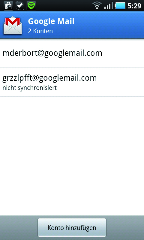 Du kannst beliebig viele Konten anlegen. Hierfür starte auf dem Handy die App Google-Mail. Betätige anschließend die Menü-Taste und tippe auf „Konten“. Eine Liste eventuell vorhandener Konten erscheint. Wenn du dieses Procedere zum ersten Mal durchführst, ist diese natürlich leer. Tippe auf die Schaltfläche „Konto hinzufügen“. Solltest du bereits über ein Google-Konto verfügen (etwa für deine E-Mails am Computer), könnst du dich darüber anmelden. Ansonsten tippe auf die Schaltfläche „Erstellen“.
