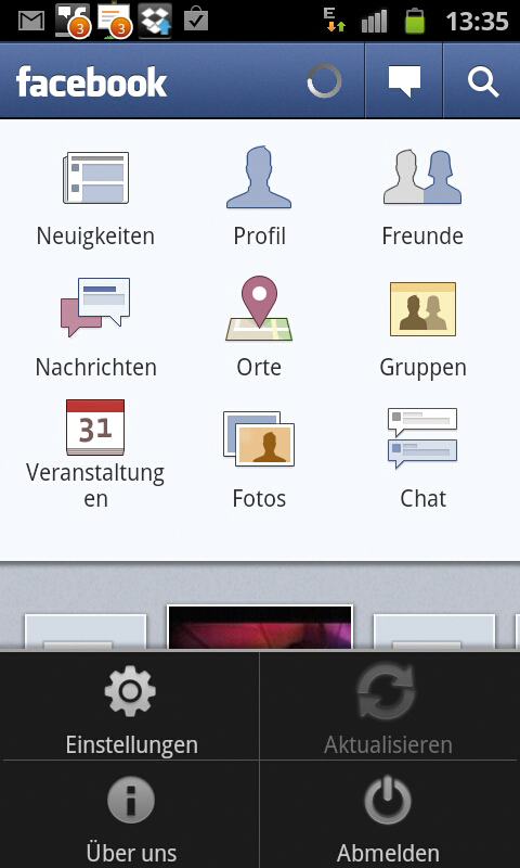 Öffne die Facebook-App und tippe auf die Menü-Taste. Wähle danach „Einstellungen“ um zu der gewünschten Funktion zu gelangen.