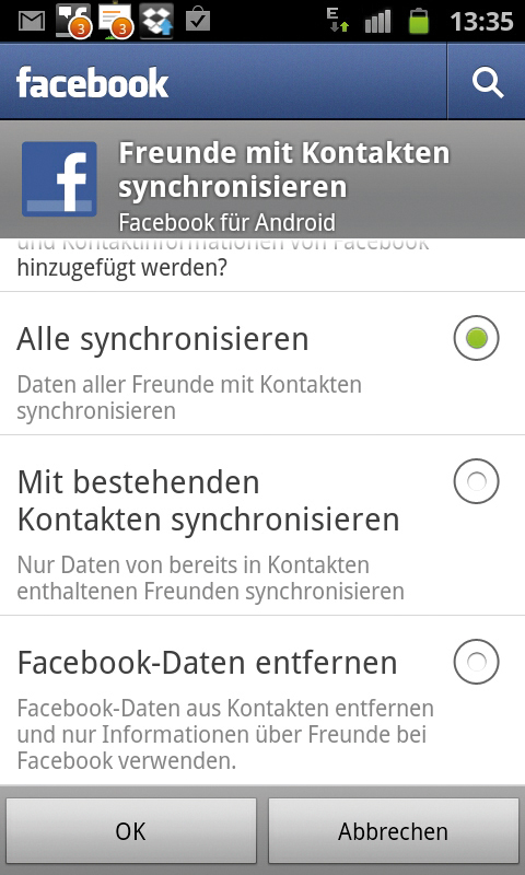 Hier kannst du entscheiden, ob du Informationen aller Facebook-Kontakte oder nur Daten von bereits in den Telefon-Kontakten enthaltenen Freunden auf dein Smartphone laden willst. Klicke zur Bestätigung auf „OK“.