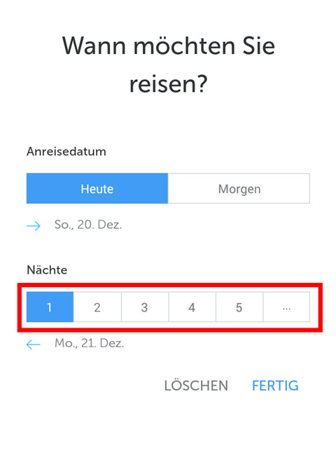 Benötigen Sie das Zimmer für mehr als einen Tag, dann tippen Sie rechts oben rechts die Kalender-Schaltfläche (1b) an und wählen anschließend den Anreisetag (heute oder morgen) und die Zahl der Übernachtungen aus.