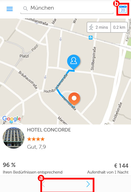 Ist das erledigt, dann erhalten Sie beim Starten der App automatisch auf einem Stadtplan ein Hotel angezeigt, das sich erstens in Ihrer Nähe befindet, das zweitens Ihren Anforderungen entspricht und das drittens am aktuellen Tag über freie Zimmer verfügt. Durch Antippen der Pfeil-Schaltflächen (1a) unten können Sie sich alternative Hotels anzeigen lassen.