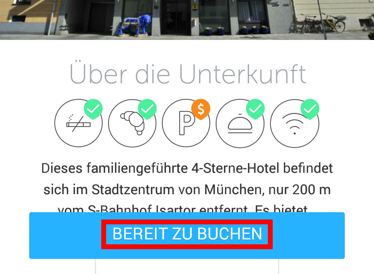 Damit Sie die App „Booking Now“ optimal nutzen können, muss die Standortfunktion des Smartphones eingeschaltet sein. Darüber hinaus müssen Sie nach dem ersten Start der App ein Benutzerkonto anlegen sowie angeben, für welche Preiskategorie Sie sich interessieren und auch welche Ausstattungsmerkmale (wie WLAN, Nichtraucherzimmer, Frühstück, Restaurant und Parkmöglichkeiten) für Sie wichtig sind.