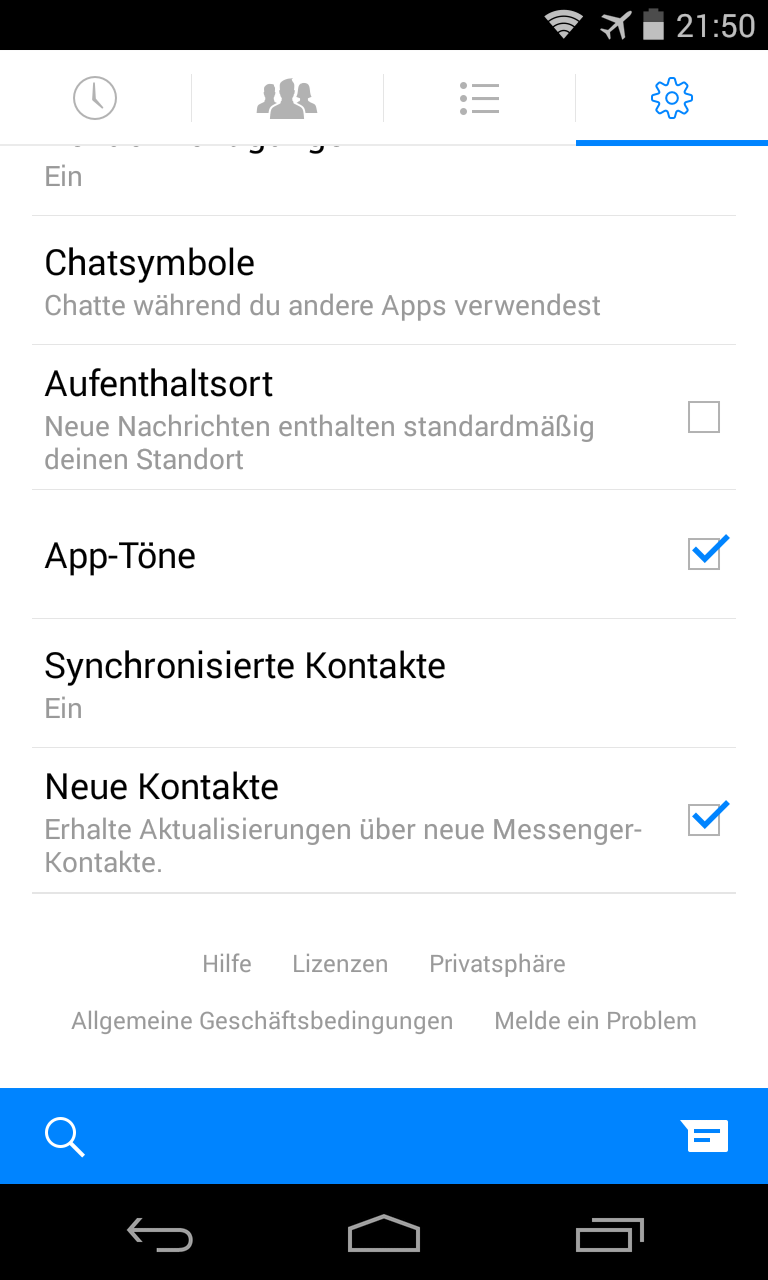 Wollen Sie nicht, dass die Nachrichten, die Sie schreiben, Angaben zu Ihrem gegenwärtigen Standort enthalten? Dann schalten Sie in den Einstellungen der App die Option „Aufenthaltsort“ aus.