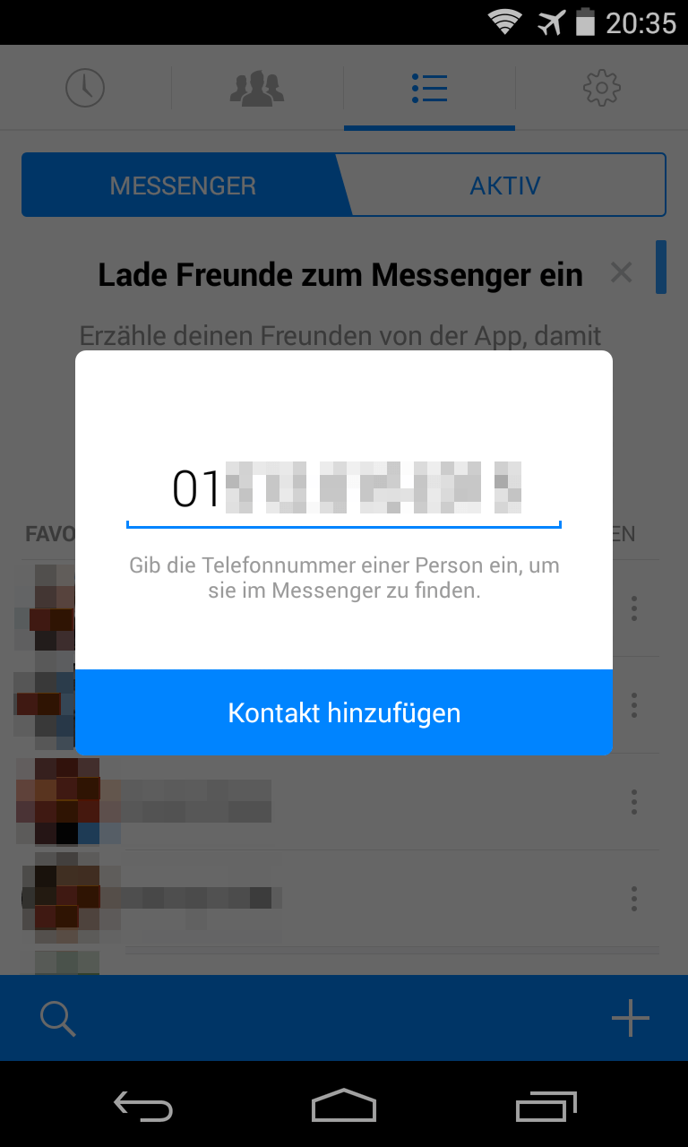 Geben Sie dann die Telefonnummer eines Bekannten ein und tippen Sie auf die Schaltfläche „Kontakt hinzufügen“. Wenn diese Telefonnummer in der FacebookÂMessenger-Datenbank enthalten ist, wird der dazugehörige Kontakt in Ihr MessengerÂAdressbuch eingefügt. Und Sie können ihm ab sofort Nachrichten schicken.