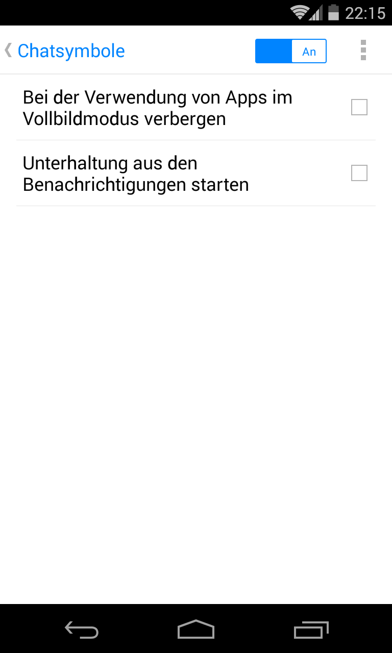 Der Messenger blendet seine Chatsymbole normalerweise nicht ein, wenn Sie eine App verwenden, die im Vollbildmodus läuft. Wollen Sie aber auch in solchen Situationen die Chatsymbole zu Gesicht bekommen? Dann tippen Sie in den Einstellungen  des Messengers die Schaltfläche „Chatsymbole“ an und schalten anschließend die Option „Bei der Verwendung von Apps im Vollbildmodus verbergen“ aus. (Komplett ausschalten können Sie die Chatsymbole im selben Fenster durch Antippen der Schaltfläche „An“.)