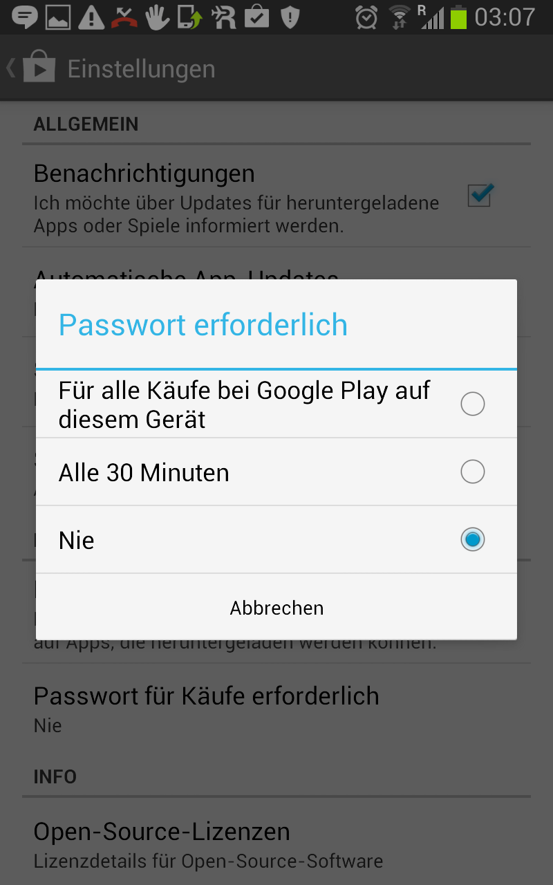 Der folgende Schritt unterscheidet sich von Telefon zu Telefon. Auf manchen Smartphones heißt die benötigte Option “Passwort für Käufe erforderlich”, während sie auf Geräten anderer Hersteller in zwei Kategorien namens “PIN festlegen” und “PIN verwenden” aufgeteilt ist. Bei einem “Passwort”-Handy genügt es an dieser Stelle, die Option “Für alle Käufe erforderlich” zu wählen.