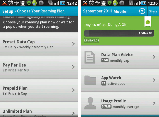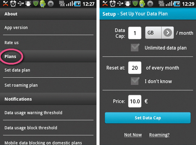 In den Einstellungen finden Sie unter ‚Plans‘ die Einstellungen für die Datenlimits: Den „data plan“ für die alltägliche Nutzung und den „roaming plan“, wenn Sie sich im Ausland befinden.