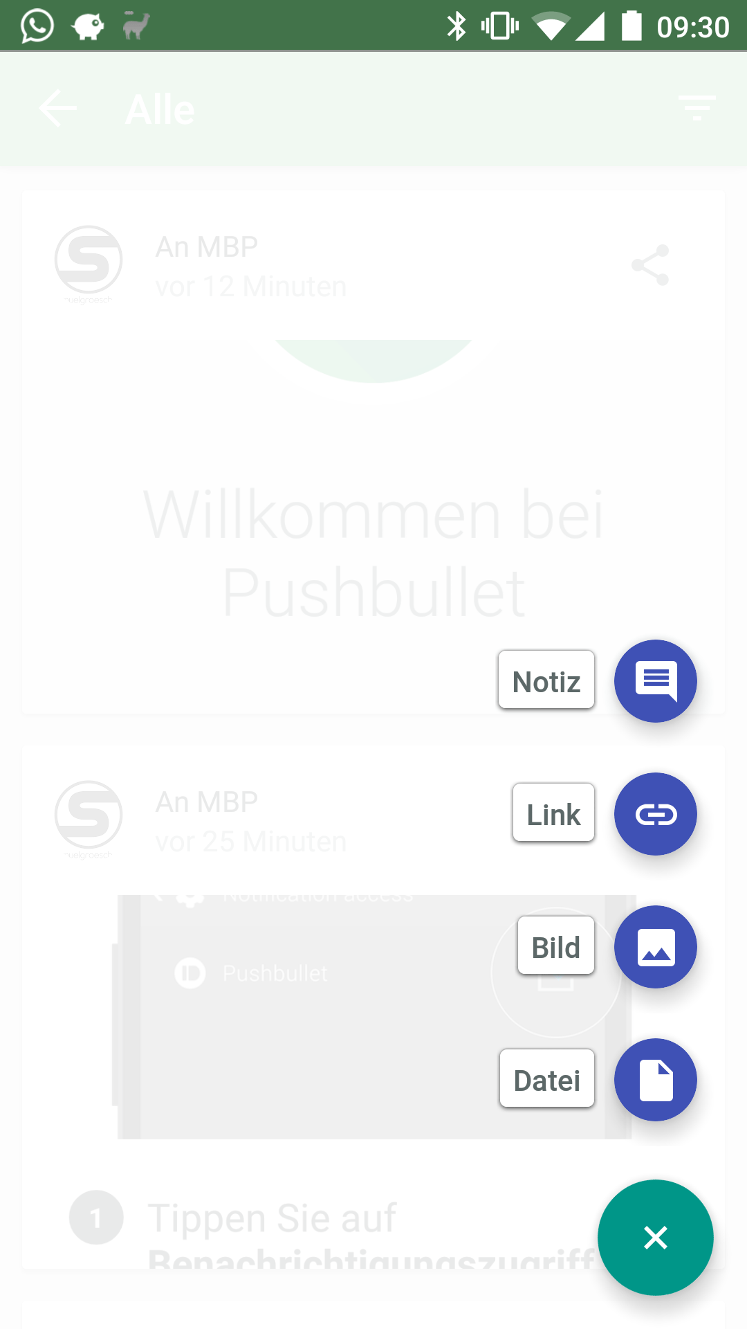 Ähnlich verhält es sich am Smartphone. Hier haben Sie von der Android-App heraus über den kleinen + Button die Möglichkeit Nachrichten an Computer, Browser oder andere mobile Geräte zu versenden. Ebenfalls integriert sich Pushbullet in das Teilen-Menü von Android, sodass Sie Links, Texte und Dateien direkt aus dem System heraus verschicken können.