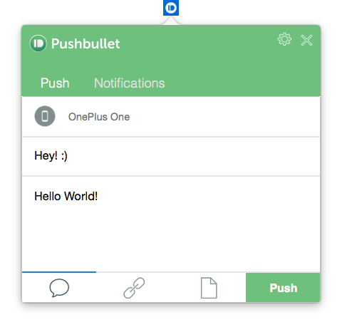 Wahlweise über ein Browser-Addon oder eine der eigenständigen Anwendungen lassen sich Nachrichten an andere, mit dem Pushbullet-Konto verknüpfte Geräte verschicken. Zur Auswahl stehen drei Nachrichten-Typen: „Notiz“, „Link“ und „Datei“. Danach entscheidet sich die Interaktionsmöglichkeit am Smartphone. Notizen können einfach kopiert, Links direkt im Browser geöffnet und Dateien heruntergeladen werden.