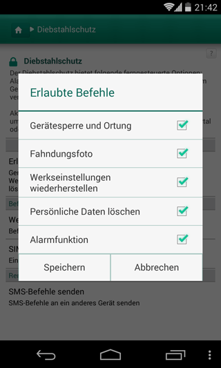 Zurück im Startfenster der App tippen Sie die Schaltfläche „Einstellungen“ an und dann die Schaltfläche „Diebstahlschutz“. Im Fenster „Diebstahlschutz“ können Sie anschließend im Bereich „Erlaubte Befehle“ festlegen, welche Diebstahlschutz-Funktionen prinzipiell eingeschaltet sind.