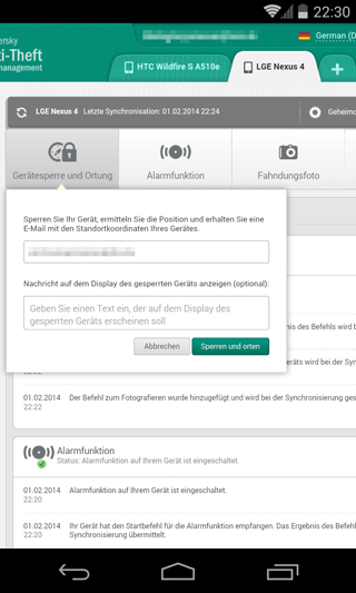 Wählen Sie auf der Web-Site anti-theft.kaspersky.com das gewünschte Smartphone oder Tablet aus, falls Sie mehrere Geräte besitzen. Klicken Sie dann auf die Schaltflächen „Gerätesperre und Ortung“ und „Sperren und orten“. Nach kurzer Zeit erhalten Sie eine E-Mail-Nachricht, die Ihnen die Koordinaten des Ortes verrät, an dem sich Ihr Smartphone befindet. Die Voraussetzung dafür ist allerdings, dass das Smartphone über eine Internet-Verbindung verfügt.