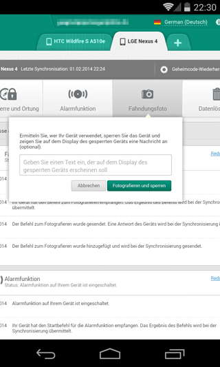Klicken Sie auf der Web-Site anti-theft.kaspersky.com die Schaltflächen „Fahndungsfoto“ und „Fotografieren und sperren“ an. Nach einiger Zeit erhalten Sie im Web-Browser mehrere Fotos der Person, die gerade Ihr Smartphone benützt. – Mit den Schaltflächen „Datenlöschung“ und „Löschen“ können Sie wahlweise Ihre persönlichen Informationen (wie das Adressbuch und die Termine) oder aber alle Daten des Smartphones löschen.
