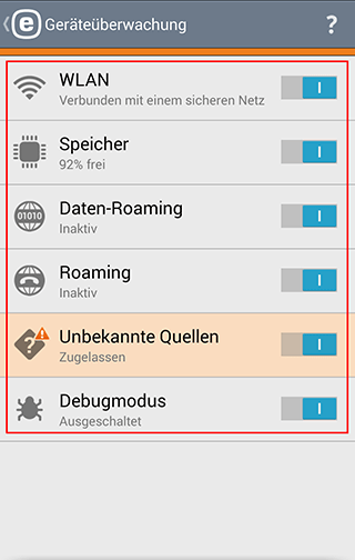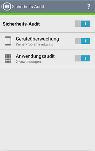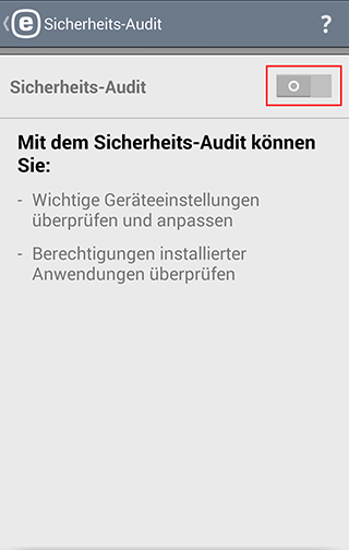 Bewegen Sie den Schalter von o auf |, damit ESET die Geräteeinstellungen und die Anwendungen auf mögliche Sicherheitsrisiken prüft.