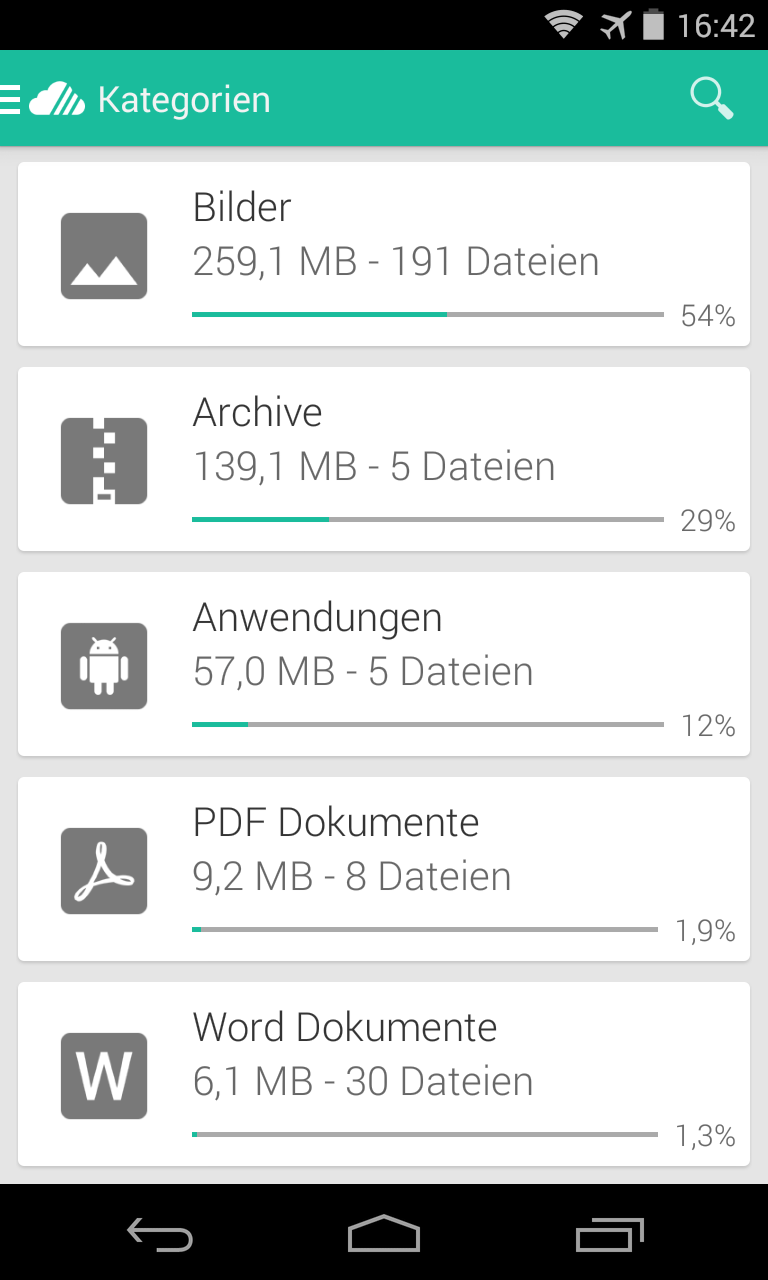 Die „Kategorie“-Funktion der App listet Ihnen den Inhalt des Cloud-Speichers übersichtlich nach Dateiarten sortiert auf.