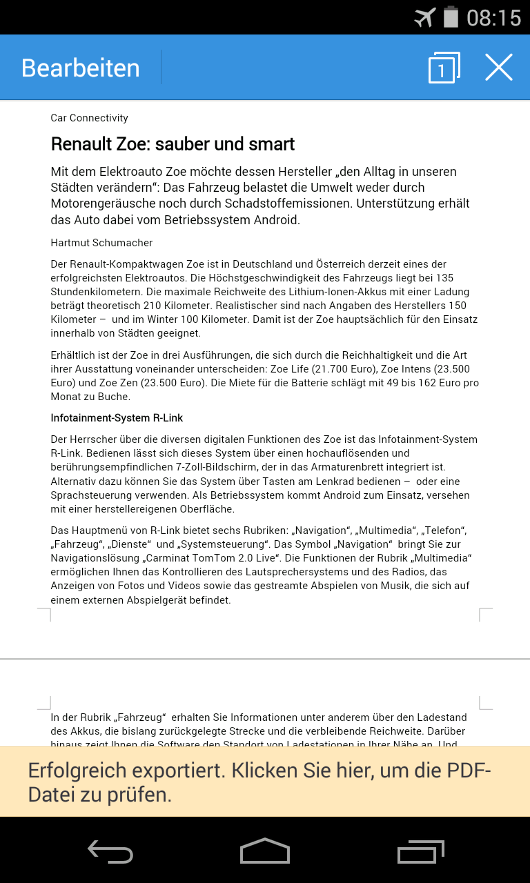 Anschließend können Sie einfach durch Antippen des Hinweises „Erfolgreich exportiert.“ das Aussehen der soeben gespeicherten PDF-Datei prüfen.