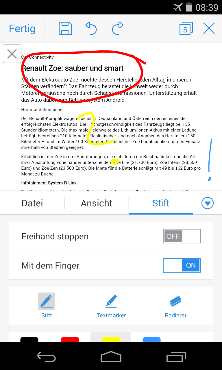 Sie können Textdateien entweder Zeichnungen oder Markierungen hinzufügen – einfach indem Sie mit dem Finger (oder mit dem Eingabestift) auf dem Bildschirm malen.