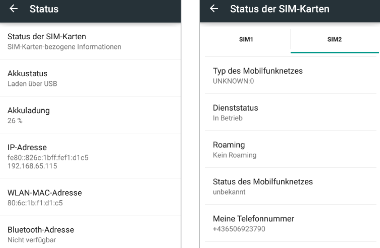 Tippen Sie nun auf „Status der SIM-Karte(n)“. Nachfolgend erhalten Sie alle Infos hierzu – einschließlich der Telefonnummer. Funktioniert leider nicht auf jedem Handy.