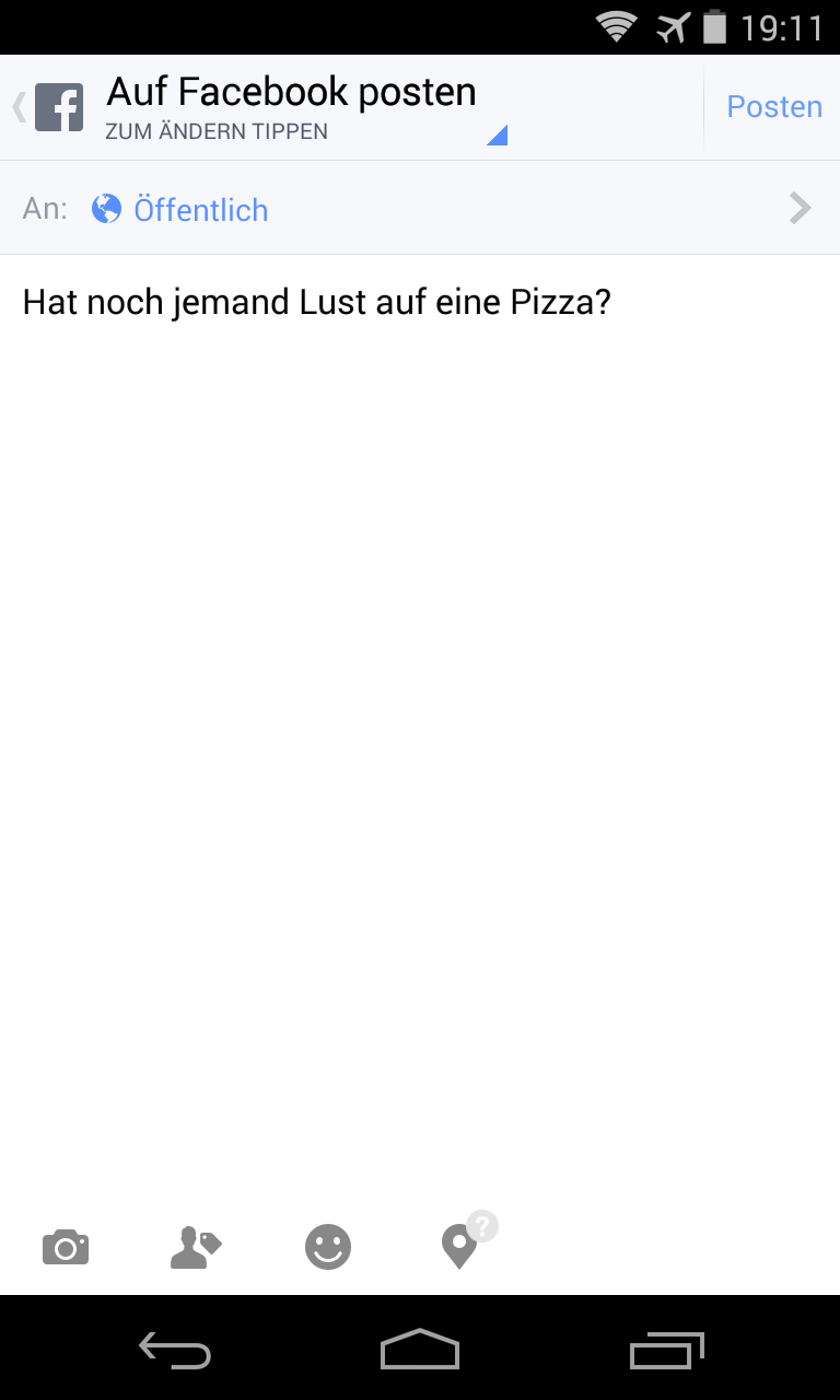 In dem Fenster, in welchem Sie einen Facebook-Beitrag eingeben können (nachdem Sie im Hauptfenster die „Status“-Schaltfläche angetippt haben), befindet sich die Option „An:“. Tippen Sie auf diese Option, um das Dialogfenster „Teilen mit“ zu öffnen, in dem Sie festlegen können, wer diesen Beitrag lesen darf.