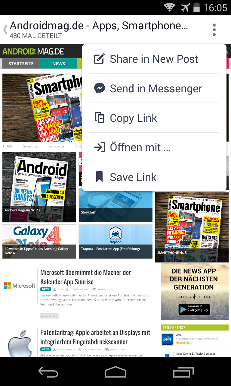 Möglicherweise aber gefällt Ihnen der neue Facebook-interne Web-Browser ja doch. Denn er ist nicht ohne Vorzüge: Er verfügt z.B. über praktische Menüpunkte zum Teilen der angezeigten Web-Seite in einem neuen Facebook-Posting, zum Verschicken der Webseiten-Adresse im Facebook-Messenger und zum Kopieren dieser Adresse in die Zwischenablage.