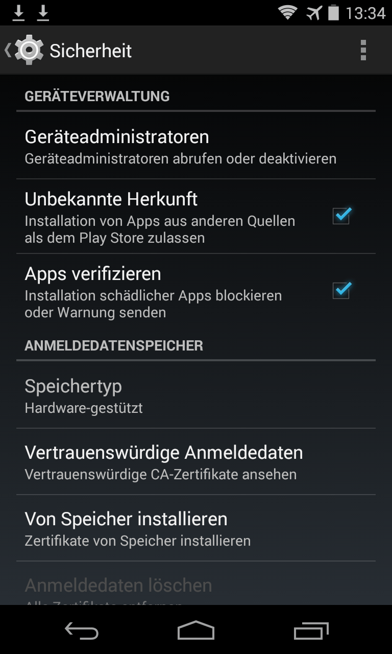 Damit das Betriebssystem sich beim Installieren nicht sträubt, müssen Sie in den Einstellungen unter „Sicherheit“ die Option „Unbekannte Herkunft“ einschalten.