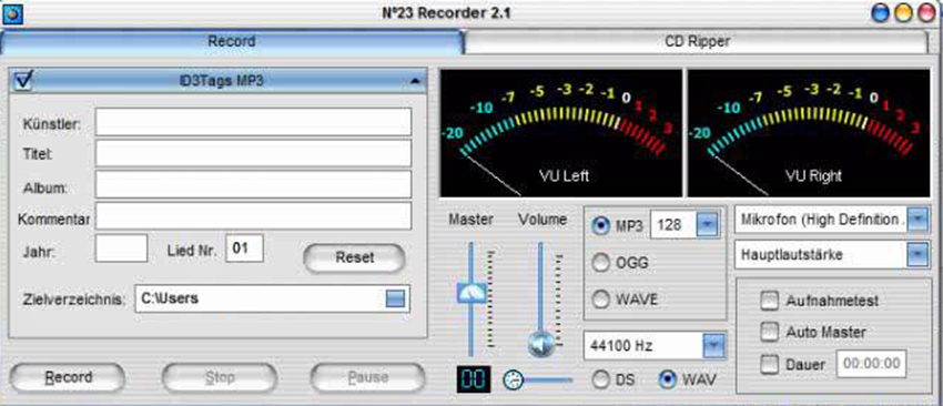Der „No23 Recorder“ lässt einige Einstellungen zu, so können Sie beispielsweise Kommentare anfügen oder das Ausgabeformat verändern. Ein Klick auf „Record“ und die Sache läuft. Die Software schneidet dann einfach das aktuell abgespielte Stück mit, Sie laden die Datei demnach nicht herunter – was im Endeffekt aber keinen Unterschied macht, in beiden Fällen befindet Sie letztendlich eine MP3-Datei auf Ihrem PC.