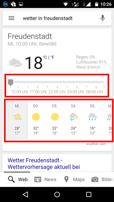 Es ist absolut nicht nötig, ein Wetterportal anzusurfen, um zu erfahren, wann Sie in den nächsten Tagen einen Regenschirm brauchen. Die Suchleiste reicht völlig aus.