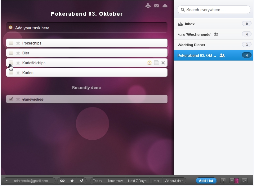 Haben Sie dann eine Liste erstellt, füllen Sie diese mit Aufgaben. Beispielsweise können Sie für den nächsten Pokerabend eine Liste an Snacks und mitzubringenden Getränken erstellen, sodass jeder Ihrer Freunde einfach etwas davon mitnimmt und nicht alles an Ihnen hängen bleibt.