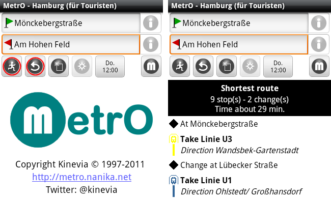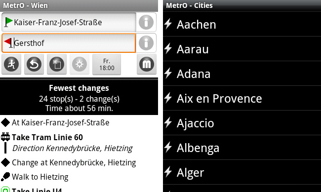 Das Programm „Métro“ kennt die U-Bahn- und Bus-Liniennetze von etwa 400 Städten in aller Welt, darunter über 50 in Deutschland und 8 in Österreich. Die App stellt die berechneten Strecken in Form von Umsteigeanweisungen dar, zeigt jedoch keine Karten an.