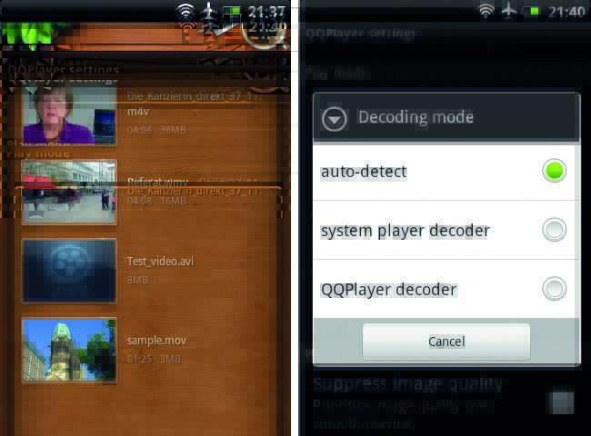 Hat die App Probleme damit, ein Video abzuspielen, so wählen Sie ein anderes Decoder-Modul aus: Verwenden Sie zu diesem Zweck im „Setting“-Fenster die Option „Decoding mode“, und wählen statt „auto-detect“ einen der Einträge „system player decoder“ oder „QQPlayer decoder“ aus.