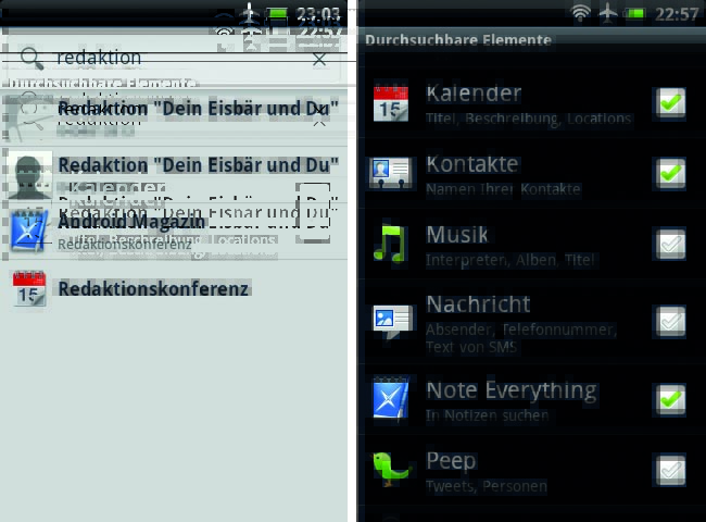 Im Fenster „Durchsuchbare Elemente“ können Sie dann aussuchen, welche Inhalte die Suchfunktion berücksichtigt. Sie dürfen zusätzlich zu den Kontakten beispielsweise auch die Anrufliste und den Terminkalender auswählen – sowie etliche der zusätzlich installierten Apps.