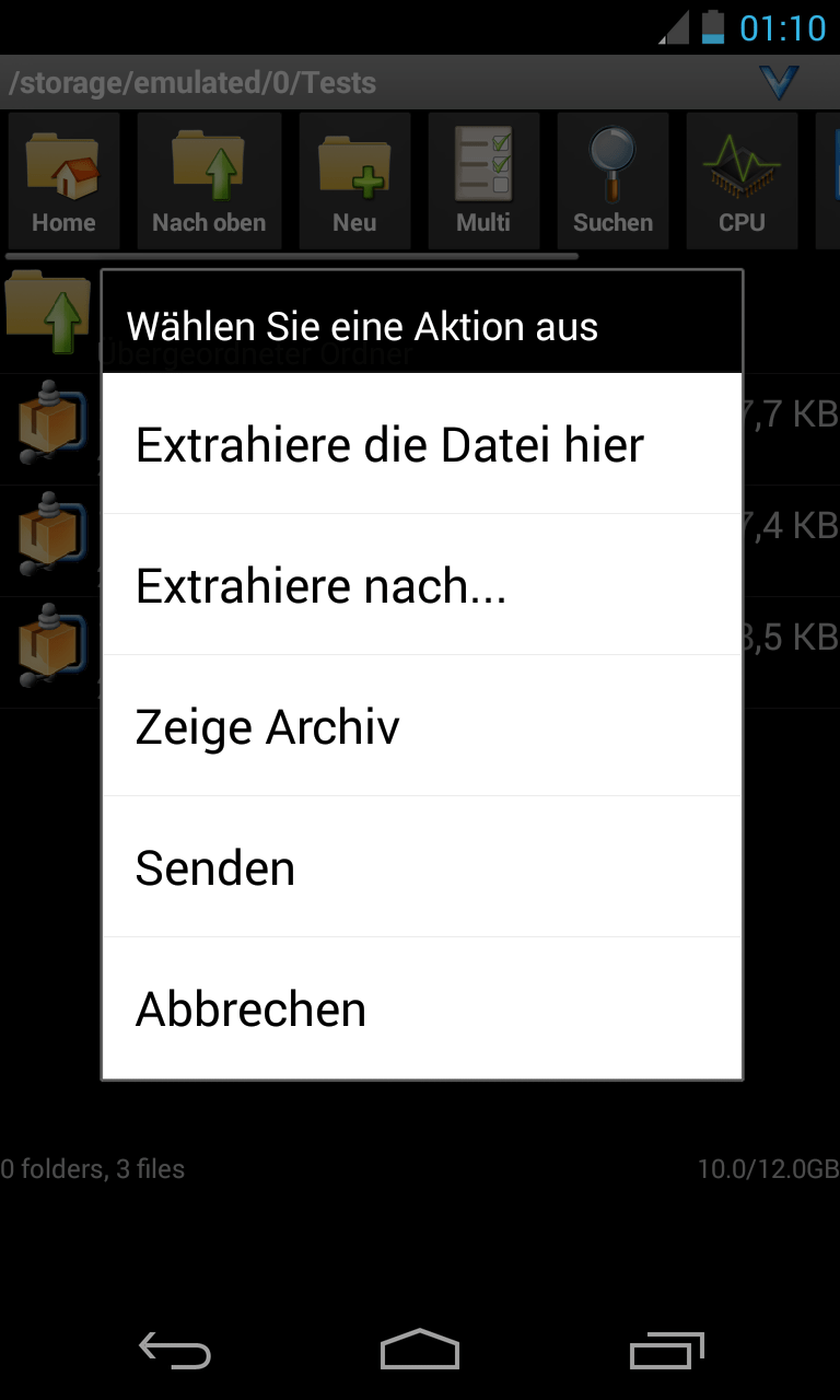 Tippen Sie eine Archivdatei an. In einem Kontextmenü können Sie dann entscheiden, ob Sie den Inhalt dieses Archivs lediglich auflisten („Zeige Archiv“) oder aber entpacken („Extrahiere“) möchten.