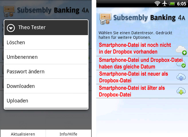 Klick einen der Datentresore im Startfenster lange an, und ruf in seinem Kontextmenü den Eintrag „Downloaden“ oder den Eintrag „Uploaden“ auf, um ihn aus der Dropbox herunter- oder um ihn hochzuladen.