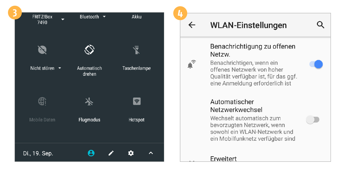 Mit Android 8.0 erhält die Benachrichtigungsleiste ein funktionelles wie optisches Update. Die Datumsleiste und der Schnellzugriff auf die Einstellungen befinden sich nun am unteren Rand der Leiste. Neu ist darüber hinaus die Möglichkeit, bei einzelnen Icons Schnelleinstellungen öffnen zu können. Beispiel „Nicht stören“: Sie können nun direkt in den Notifications festlegen, in welchen Fällen Sie eine akustische Benachrichtigung wünschen. Anderes Beispiel: Ein Tipp auf den kleinen Pfeil neben dem WLAN-Icon öffnet eine Übersicht aller verfügbaren Netzwerke.