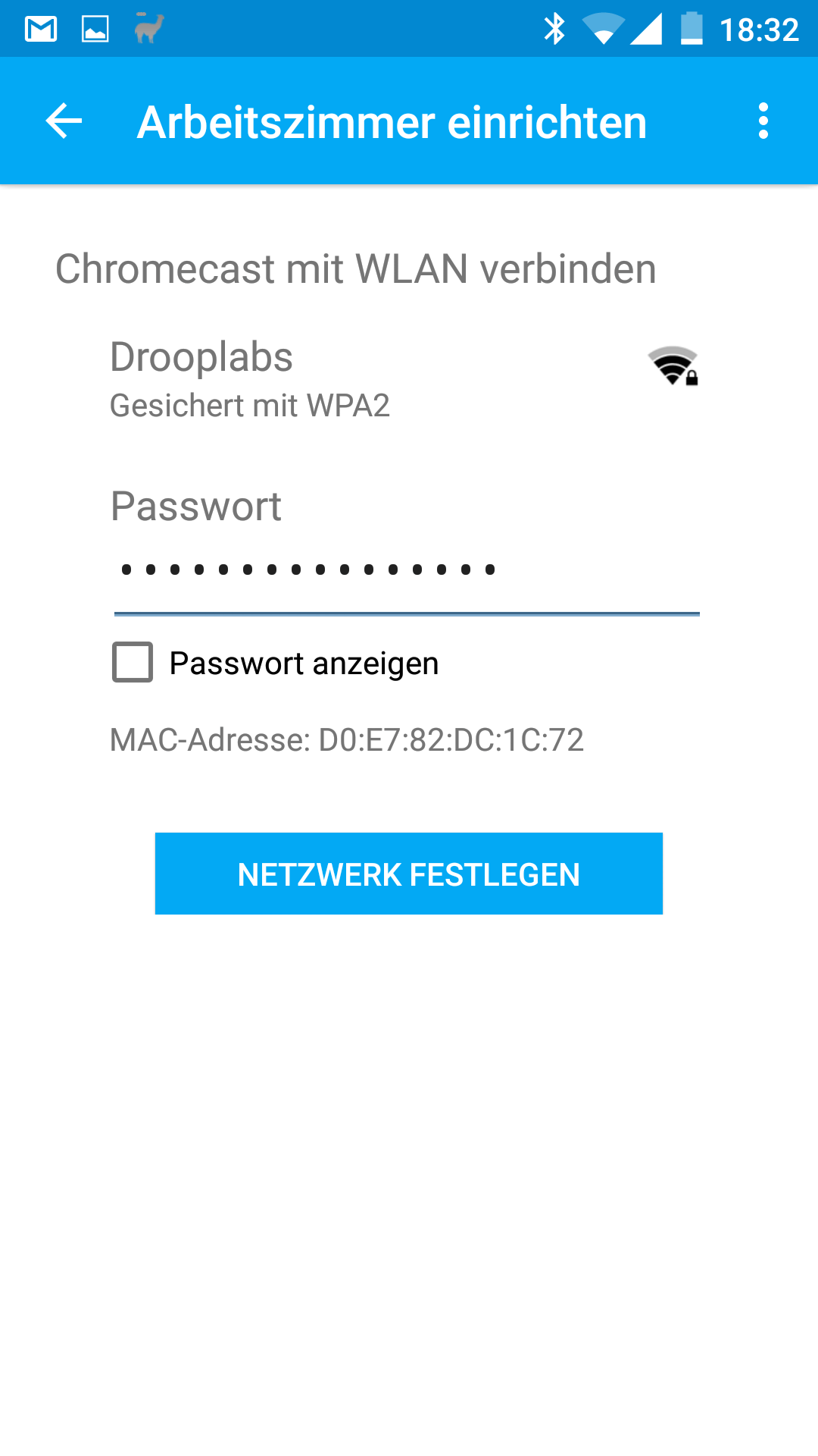 Um Inhalte auf dem Chromecast darstellen zu können, muss dieser sich in Ihr WLAN-Netzwerk einloggen können. Geben Sie dazu das WLAN-Passwort Ihres Netzwerks ein und tippen Sie auf die Schaltfläche „Netzwerk festlegen“.