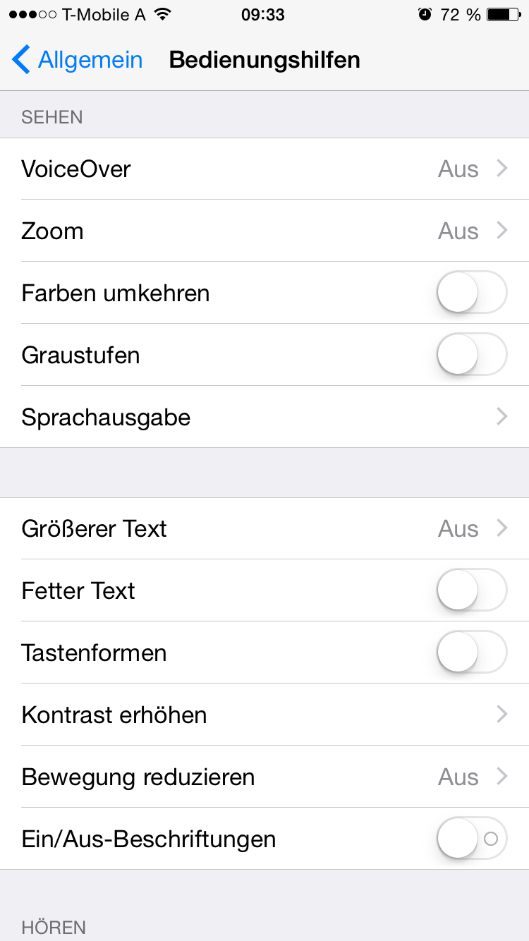 Tippen Sie zu diesem Zweck in den Einstellungen die Schaltflächen „Allgemein“ und „Bedienungshilfen“ an. Im Fenster „Bedienungshilfen“ schalten Sie dann die Optionen „Bewegung reduzieren“ und „Kontrast erhöhen – Transparenz reduzieren“ ein.