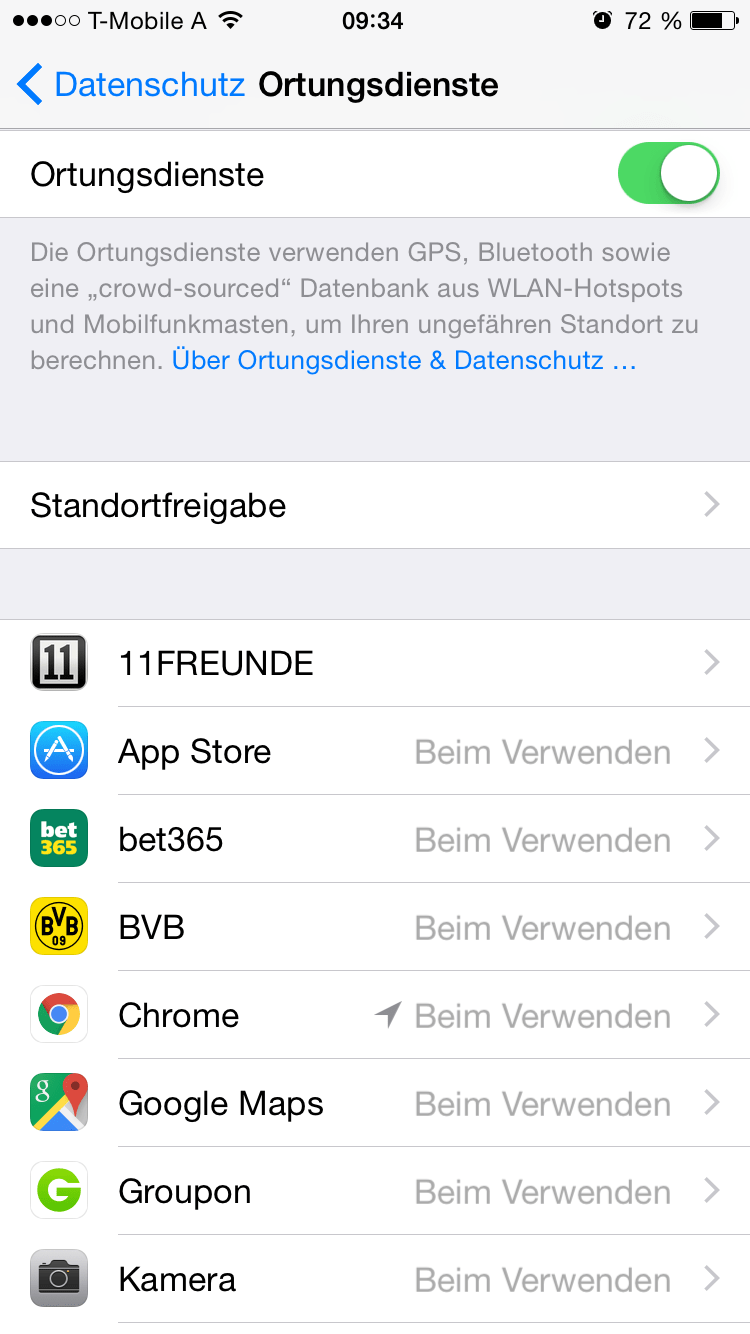Tippen Sie zu diesem Zweck in den Einstellungen die Schaltflächen „Datenschutz“ und „Ortungsdienste“ an. Anschließend können Sie für jede einzelne App festlegen, ob sie die Ortungsdienste verwenden darf oder nicht.