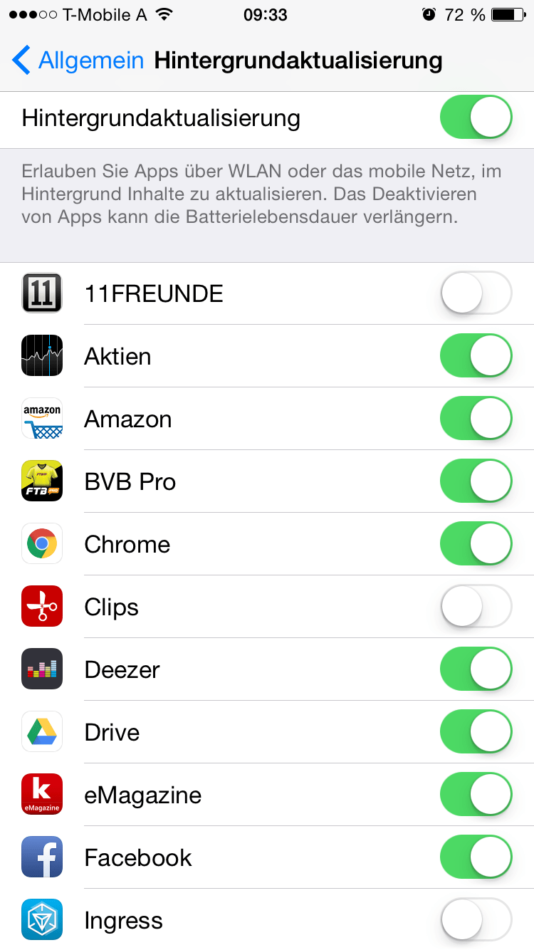 Das Betriebssystem erlaubt den Apps, ihre Daten auch im Hintergrund zu aktualisieren. Machen zu viele Apps von dieser Möglichkeit Gebrauch, dann kann dies auf älteren iPhone-Modellen zu Verzögerungen führen. Schalten Sie daher die Hintergrund-Aktualisierung für diejenigen Apps aus, die Sie nur selten verwenden. Zu dem Fenster, in dem Sie das erledigen können, gelangen Sie, indem Sie in den Einstellungen die Schaltflächen „Allgemein“ und „Hintergrundaktualisierung“ antippen.