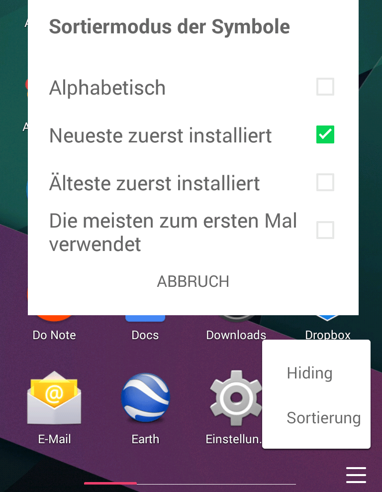 In der Apps-Schublade können Sie die Reihenfolge der Symbole verändern: Rufen Sie über das Menüsymbol in der rechten unteren Ecke den Eintrag „Sortierung“ auf. – Mit Hilfe des Menüpunkts „Hiding“ können Sie Apps, die Sie nie verwenden, ausblenden.