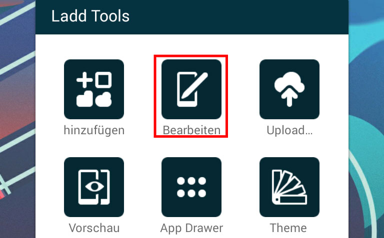 Tippen Sie etwa zwei Sekunden auf den Startbildschirm, um das Dialogfenster „Ladd Tools“ aufzurufen. Tippen Sie in diesem Fenster die Schaltfläche „hinzufügen“ an, wenn Sie der Seite Apps- und Ordner-Symbole oder App-Widgets hinzufügen wollen. Wenn Sie dagegen grafische Elemente und eigene Widgets hinzufügen möchten, dann tippen Sie stattdessen die Schaltfläche „Bearbeiten“ an. Sie landen dadurch im Bearbeitungsmodus, erkennbar an der (verschiebbaren) Werkzeugleiste am oberen Bildschirmrand.