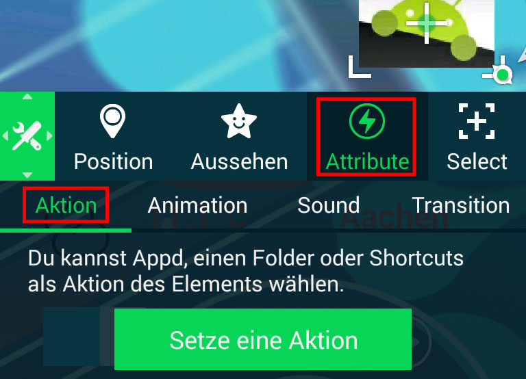 Tippen Sie erst auf das Element, das Sie bearbeiten möchten, und dann auf die Schaltfläche „Attribute“ in der Werkzeugleiste. Tippen Sie im Register „Aktion“ auf die Schaltfläche „Setze eine Aktion“. Anschließend können Sie die App oder die Verknüpfung auswählen, die das Smartphone starten soll, wenn Sie dieses Element später antippen.