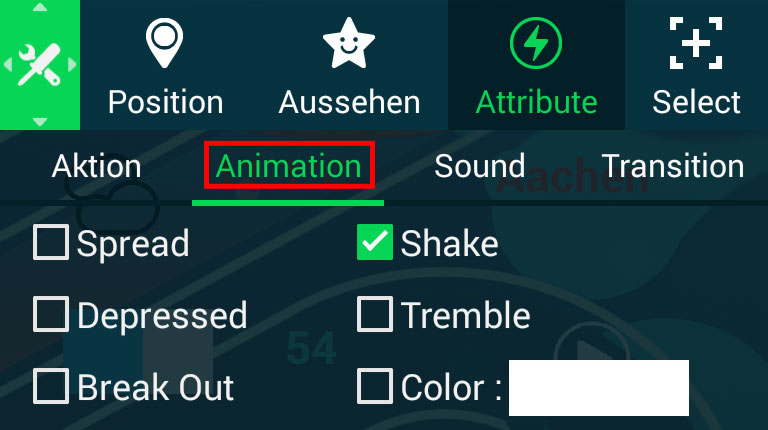 Im „Attribute“-Register „Animation“ können Sie festlegen, auf welche Art das Element sein Aussehen verändert, wenn Sie es antippen.