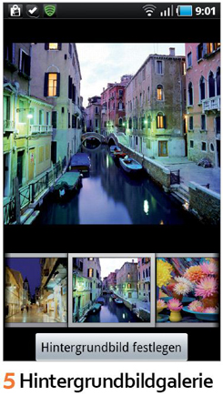 Die Hintergrundbildgalerie bietet eine bescheidene Auswahl an mitgelieferten Bildern. Die unteren Thumbnails lassen sich verschieben. Ist das gewünschte Bild in der Mitte, tippen Sie auf „Hintergrundbild festlegen“.