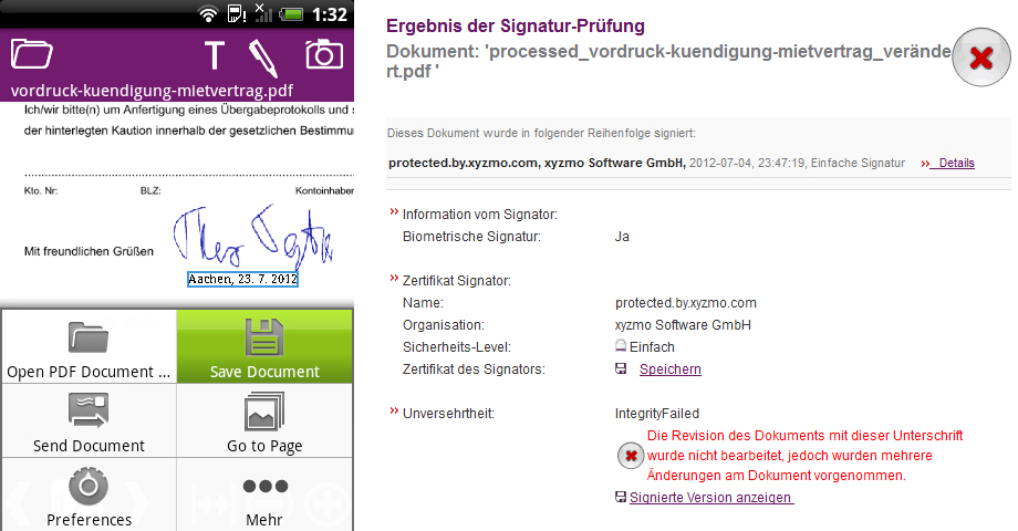 Die kostenlose App Significant ermöglicht es euch, PDF-Dateien zu unterschreiben. Beim späteren Betrachten mit dem Adobe Reader erscheinen Warnhinweise, wenn eine Datei nach dem Unterschreiben noch verändert wurde.