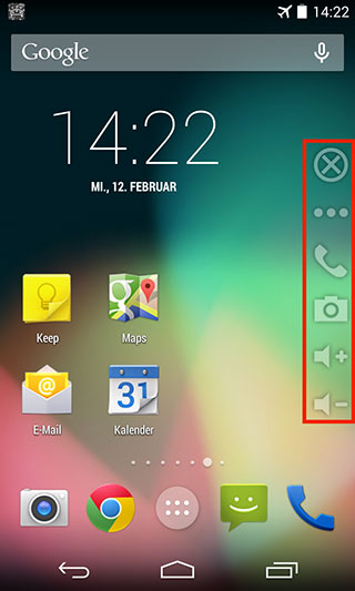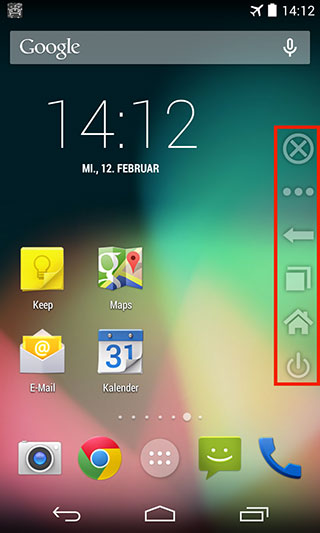 Auf der Leiste finden Sie drei Symbole, die den Hardware-Tasten „zurück“, „laufende Apps“ und „Startbildschirm“ entsprechen. Das unterste Symbol schaltet den Bildschirm aus – vorausgesetzt, Sie schalten in den Einstellungen der App …