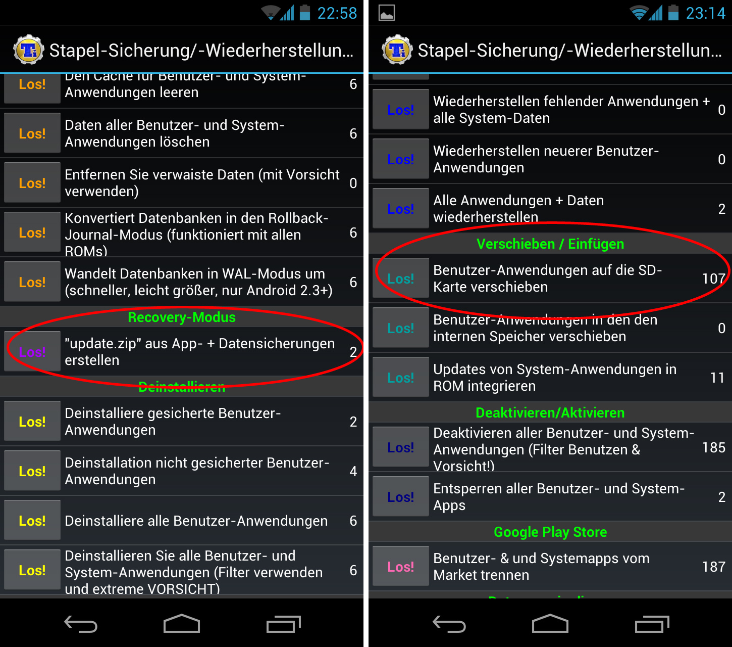 Wer seine Daten per Nandroid-Backup im Recovery-Menü sichert, kann die Apps oder auch nur deren Daten auch über die Vollversion von Titanium Backup wiederherstellen. Einfach das gewünschte Backup auswählen und dann entscheiden ob man nur einzelne, alle oder fehlende Apps und/oder deren Daten wiederherstellen möchte.