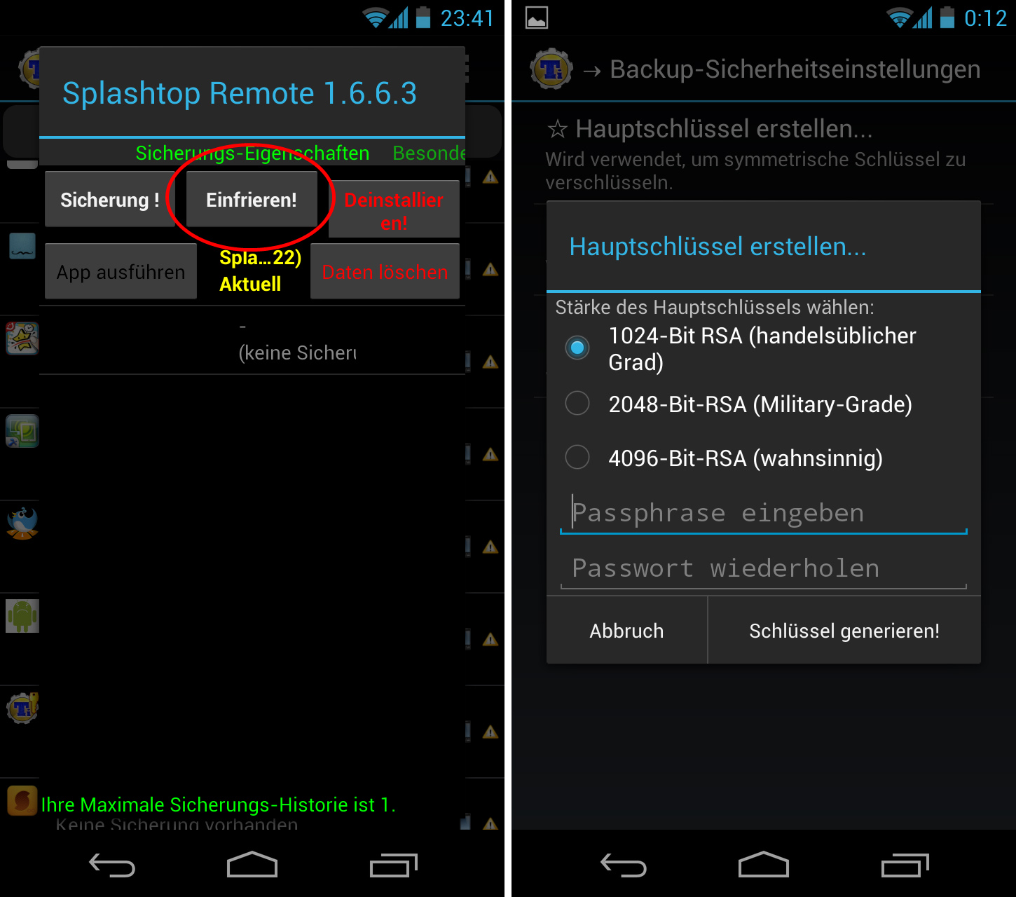 Apps und Daten zu sichern, heißt noch lange nicht, dass sie auch sicher sind. Wer sein Backup und somit seine persönlichen Daten durch ein Passwort vor fremden Zugriffen schützen will, wird in den Einstellungen von Titanium Backup Pro fündig. Hier lassen sich verschiedene Schlüsselstärken bis zu 4096-Bit sowie die symmetrische Schlüsselstärke einstellen.