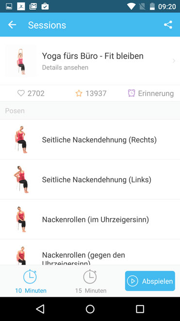 Nackenschmerzen von der Arbeit vor dem Bildschirm? Ein steifer Hals, da auf der Fernseh-Couch Âeingenickt? Überhaupt zu wenig Bewegung und dadurch verkürzte Bänder und in der Folge VerspannungsÂkopfschmerz? Dagegen hilft Yoga – auch Männern, die das als nicht besonders angemessen empfinden. In dieser App stehen einem nach unkomplizierter Anmeldung und Definition der Trainingsziele (u.a. „Flexibler werden“ oder „Körperstraffung“) einige Übungen kostenlos zur Verfügung, die einem mit Video und Sprachanleitung vor dem Hintergrund angenehmer Musik erklärt werden. Ganze Trainingsprogramme kann man sich auch vornehmen, spezielle Sessions sind in Verbindung mit einem günstigen Abo verfügbar.